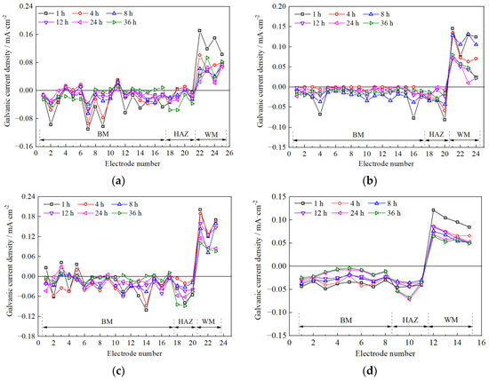 Figure 5 shows the galvanic current density distribution of each microelectrode in a 3% NaCl solution saturated with CO2 for the simulated X80 steel welded joints with different area ratios at 40 °C and different coupling times. The galvanic current density of WM in the simulated X80 steel welded joint was anodic, and the galvanic current density of BM and HAZ was cathodic. The WM acted as the anode of the simulated X80 steel welded joint, whereas the HAZ and BM acted as cathodes. The galvanic current density of all parts of the simulated welded joint of X80 steel decreased with increasing immersion time, and the maximum galvanic current density of the anode appeared at the junction of WM and HAZ.