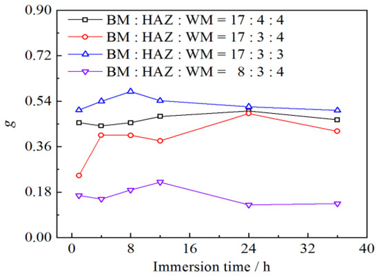 g was used to quantify the influence of the area ratio of different regions in the simulated X80 steel welded joint on galvanic corrosion, as shown in Figure 6. The galvanic corrosion intensity of the simulated X80 steel welded joint with different area ratios generally increased initially, then decreased and tended to stabilize. For BM:HAZ:WM = 17:3:3, the galvanic corrosion of the simulated X80 steel welded joint was the worst, and the value of g was always greater than 0.5. For BM:HAZ:WM = 8:3:4, the galvanic corrosion of the simulated weld of X80 steel was the most minimal and the value of g was always less than 0.3. From the changes in the value of g, it can be seen that as the area of WM decreases, the galvanic corrosion intensity increases, while the area of BM and HAZ decreases, the galvanic corrosion intensity decreases. The area changes in WM have a greater influence on galvanic corrosion.