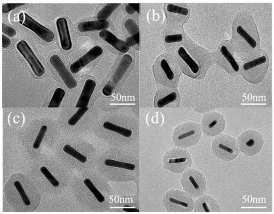 TEM images of AuNRs@SiO2 composites prepared with different volumes of TEOS solution (20% in methanol): (a) 150 μL, (b) 270 μL, (c) 360 μL, and (d) 540 μL.