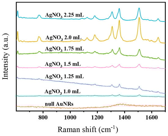 SERS-detection profiles of 10−5 M R6G probe molecules enhanced by AuNR substrates prepared with different volumes of AgNO3 solution.