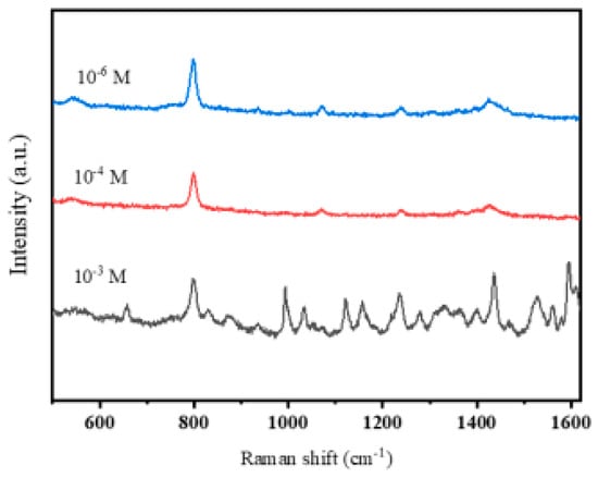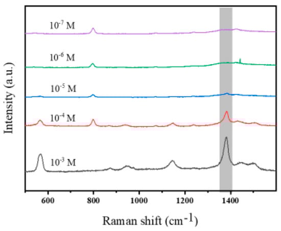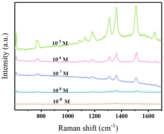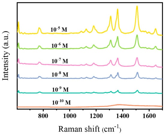 The use of AuNRs@SiO2 as a substrate was studied using different R6G concentrations (10−6 M to 10−10 M) to determine the LOD for R6G, as shown in Figure 9. With decreasing R6G concentration, the characteristic peak of R6G declines. A very low-intensity peak can be observed at a concentration of 10−9 M, but this characteristic peak is no longer observable at 10−10 M. Therefore, the lower LOD for R6G is 10−9 M.