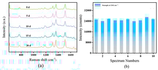 The reproducibility of the AuRs prepared with 2 mL of 10 mM AgNO3 solution was evaluated for the detection of the 10−5 M R6G solution, as shown in Figure 5. The prepared AuNRs were tested after storage in a dry environment at room temperature in the dark for 1 day, 5 days, 10 days, 15 days, and 30 days. As displayed in Figure 5a, the intensity of the characteristic peaks does not significantly change after storage for up to 30 days, confirming the good stability and reproducibility of the AuNRs. Figure 5b displays a comparison of the peak intensity at 1361 cm−1, obtained by taking any ten points on the “coffee ring” for signal acquisition. The variation in intensity is small, demonstrating the good repeatability of AuNRs as a substrate for the trace detection of R6G.