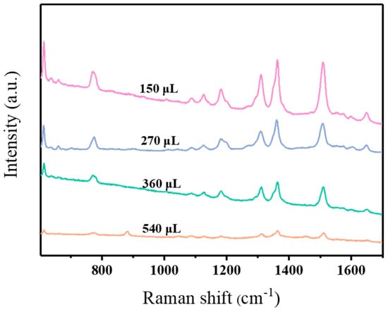 AuNRs@SiO2 substrates with different SiO2 coating thicknesses were prepared using the AuNRs with an aspect ratio of 4.53 for the detection of a 10−5 M R6G solution, as shown in Figure 8. Using the TEOS solution (20% in methanol, volumes of 150 μL, 270 μL, 360 μL, or 540 μL) to coat the AuNRs negatively affects the signal enhancement of the R6G solution. This is because silica acts as a spacer to hinder the exchange of electrons, which affects the Raman signal. The AuNRs@SiO2 substrate with a SiO2-shell thickness of about 15 nm (i.e., prepared with 150 μL of TEOS solution) provides the strongest R6G Raman signal of these substrates. As the SiO2-shell thickness increases, the exchange of electrons is increasingly hindered, leading to an increasingly reduced Raman signal.