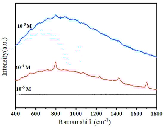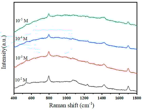 The AuNRs prepared using 2 mL of 10 mM AgNO3 solution were further studied as a substrate for the detection of thiram in acetone. The Raman-scattering intensities obtained for solutions of different concentrations are shown in Figure 6, indicating that the LOD is 10−5 M. These results confirm the ideal detection performance of the AuNR substrate for thiram solutions.