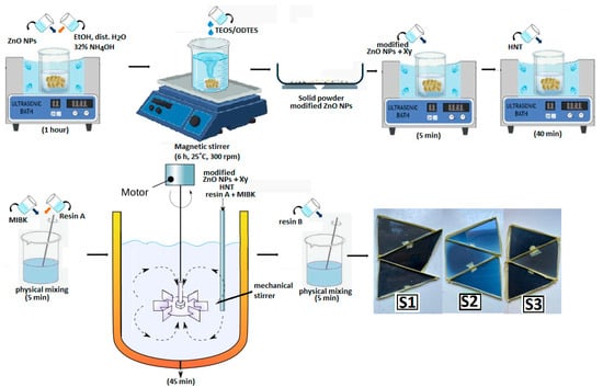 Processing steps for epoxy resin are the following. The modified ZnO with xylene (Xy) was sonicated for 5 min in an ultrasonic bath. Aluminosilicate clay with a hollow tubular morphology (HNT) was then added and left to be ultrasonicated for 40 min. Methyl isobutyl ketone (MIBK) was poured over component A from the epoxy resin and manually mixed with it for 5 min. All these components were mixed for 45 min with a mechanical stirrer (800 rpm). The mechanical agitator head’s shape was specifically designed to prevent bubbles from forming in the material. The last stage involved physically combining resin A with all integrated components and hardener B for five minutes. Three types of modified epoxy resin composites were finally obtained: HNT/epoxy resin (S1), HNT/ZnO/epoxy resin (S2) and HNT/ZnO-ODTES/epoxy resin (S3) (see Table 1). The final materials were coated onto the metal substrates and left for 48 h at room temperature for complete curing.