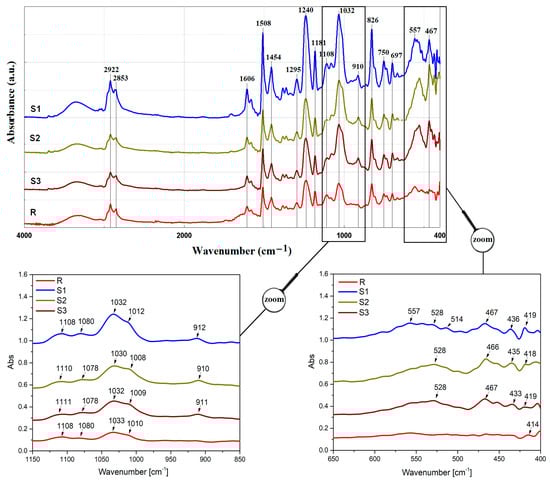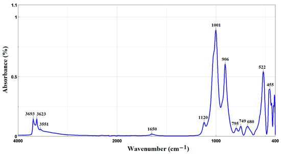 The peak identified at ~910 cm−1 is observed in the FTIR spectra of samples S1–S3 and is associated with Si–O bending vibrations []. The peaks located at ~1010/1032 cm−1 and ~1110 cm−1 are attributed to the OH deformation of inner hydroxyl groups from Al–OH and to the Si–O bonds (in-plane and perpendicular stretching vibrations), respectively []. The peaks located at 467 cm−1, 528 cm−1 and ~436 cm−1 are attributed to Si–O–Si bond bending vibrations and to the Si–O–Si deformation band [,].