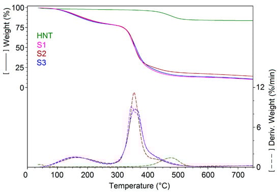 Thermogravimetric analysis curves of samples: HNT, S1, S2, S3 and S4.