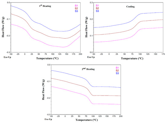 DSC curves of samples (top—first heating; down—second heating) S1–S3.