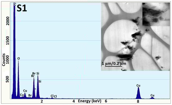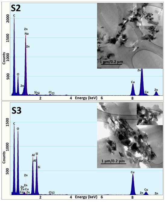 The morphology and elemental analysis of the samples were assessed by Transmission Electron Microscopy (TEM) equipped with energy-dispersive X-ray (EDX). The TEM images and EDX analysis are illustrated in Figure 6.