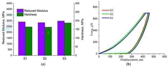 (a) Indentation reduced modulus and hardness; (b) force vs. displacement curves of samples S1–S3.