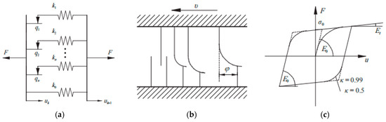 This “top-down” modeling approach describes the energy dissipation and damping characteristics of connected structures. One such model, the Iwan model [6], can be represented as a model with N Jenkins cells side-by-side, as shown in Figure 4. All spring coefficients are the same and equal to k (k1, k2kN). The slider has no mass and is subjected to a normal force FPi. The subscripted letter I indicates the index of the slider, ranging from 1 to n. The fork symbol on the slider indicates the direction of the normal force. All coefficients of friction between the sliders and the plane are the same, denoted by m. Therefore, the critical friction fi* that causes sliding for each slider can be calculated as follows: