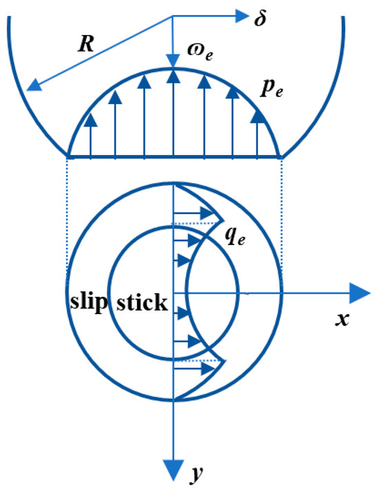 The smooth plane assumption assumes that the contact between the asperity and a smooth rigid flat plate is carried out, and the elastic-plastic changes and contact mechanical characteristics of the asperity subjected to normal and tangential loads are analyzed, as shown in Figure 6.