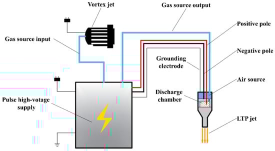 The LTP surface treatment device used in this study was a pulsed corona discharge low-temperature plasma jet generation device. It mainly consists of three components: a pulsed high-voltage power supply, a vortex blower, and a plasma spray gun, as shown in Figure 1.