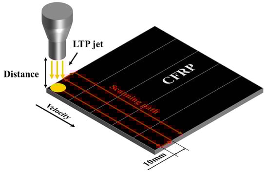 After the pretreatment of the samples was completed, the CFRP underwent LTP surface treatment using the LTP surface treatment device with different process parameters, as shown in Table 5. During the processing, scanning of the same surface area was repeated 1 to 3 times, depending on the test parameters. Five samples were prepared for each parameter group, and the LTP surface treatment process is shown in Figure 3.