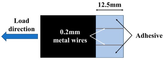 As shown in Figure 4, metal wires parallel to the load direction were placed on the surface of the sample. The end of the sample was then aligned with the 12.5 mm overlap area line. Fixtures were used to secure both sides of the overlapping area and apply equal pressure to the sample for curing. Finally, a tool was used to remove the excess adhesive. To eliminate errors caused by environmental temperature and humidity, each group of five samples was placed in a vacuum drying oven at 30 °C for 4 h to ensure complete curing of the adhesive. After the adhesive had fully cured, the samples were removed from the oven and subjected to testing.