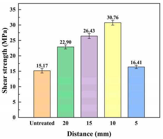 The shear strength of CFRP/Al7075 lap joints with different LTP surface treatment distances is shown in Figure 5.