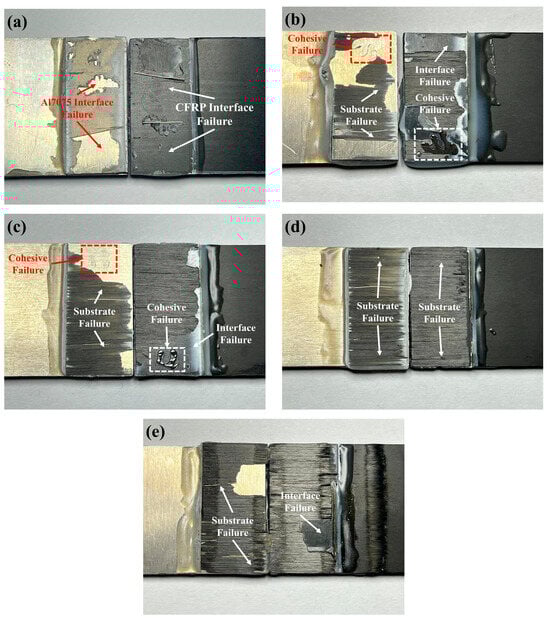 Failure modes of CFRP/Al7075 adhesive joints with different LTP surface treatment distances (a) Untreated (b) 20 mm (c) 15 mm (d) 10 mm (e) 5 mm.