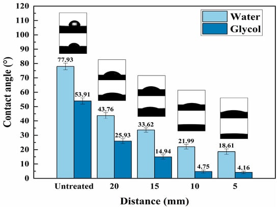 The contact angles between the CFRP surface and water and glycol at different LTP surface treatment distances are shown in Figure 8.