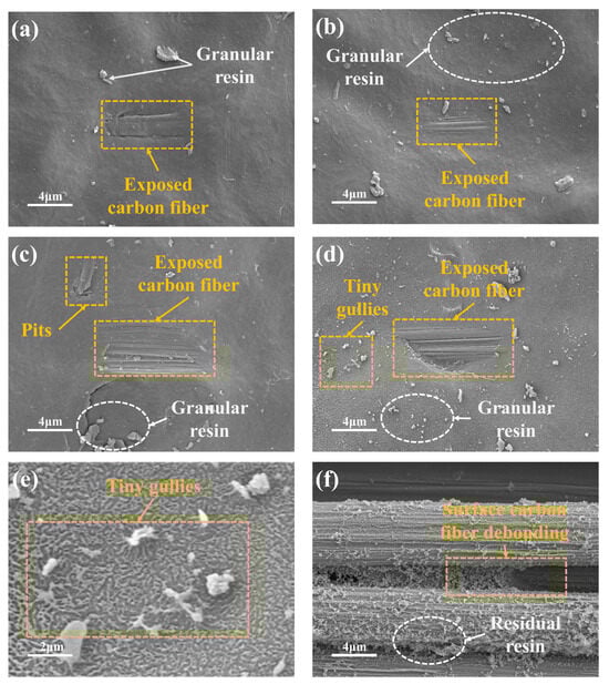 Surface micromorphology of CFRP with different LTP surface treatment distances (a) Untreated (b) 20 mm (c) 15 mm (d) 10 mm (e) Partial Enlarged Image of 10 mm group (f) 5 mm.