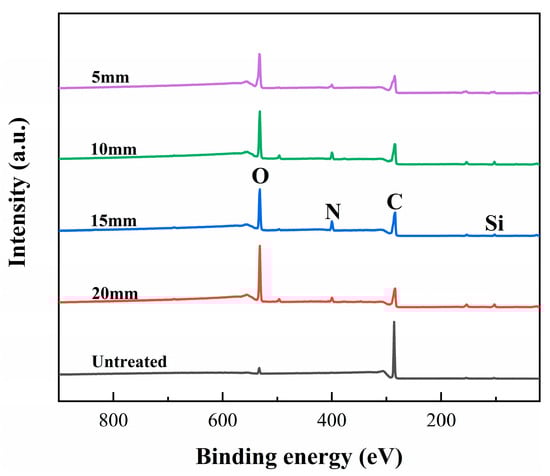 Research has shown that the excited-state radicals present in LTP carry a significant amount of energy, capable of breaking any organic chemical bond. Through LTP surface treatment, a series of complex grafting and crosslinking reactions occur on the CFRP surface, leading to changes in the surface’s chemical structure. The fracture of certain organic bonds in CFRP generates new reactive groups, thereby enhancing the surface’s chemical activity []. The relative elemental content and XPS wide-scan spectrum of CFRP surfaces with different LTP surface treatment distances are shown in Table 10 and Figure 11.