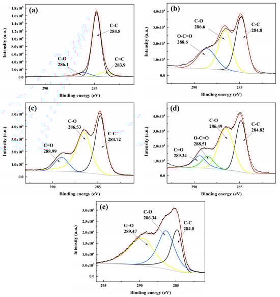 The results of C1s peak fitting of CFRP with different LTP surface treatment distances are shown in Figure 12. The black scattered points in the figure represent the raw data, the red curve represents the fitted curve, and the gray curve represents the baseline. The absorption peaks of different functional groups are represented by curves of different colors.