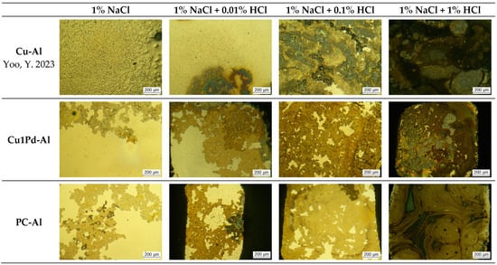 Figure 5 shows the surface appearance, documented by optical microscopy (OM), of Al after the electrochemical galvanic corrosion test between sputtered Al and Cu, Cu1Pd and PC wire. It can be seen from the figure that the corrosion of Al accelerated with increasing HCl concentrations. The results show similar trends not only for Cu wire, but also for Pd alloying and coating.