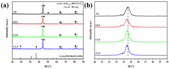 As for the sample C0, α-Fe, CFe15.1, (Fe, Cr)7C3, and Fe3Al phases were detected, as shown in Figure 3. The molten decomposition of some of the MgAl2O4 under a high-energy laser beam produced Al2O3, which then interacted with the surrounding Fe to generate Fe3Al. The intensity of the diffraction peak of the CFe15.1 phase was reduced in the samples with CeO2 added compared to the sample C0. The C atoms precipitated during the cooling process of CFe15.1 were reacted with elements such as Fe and Cr, which ultimately contributed to the enhancement in the intensity of the diffraction peaks of the α-Fe and (Fe, Cr)7C3 phases [23]. When the content of CeO2 was 1.5 wt%, a new phase appeared in the coating. It could be seen by comparing the standard PDF card that the new phase was CeAl2. Meanwhile, the generation of the new phase of CeAl2 might be due to the reaction of the partially decomposed Al2O3 with the highly chemically active Ce atoms [8,24]. Moreover, it was difficult to detect CeO2 diffraction peaks in the samples with CeO2. On the one hand, this was related to the small amount of CeO2 added. On the other hand, it was due to the reaction of CeO2 with the rest of the elements to generate new phases.