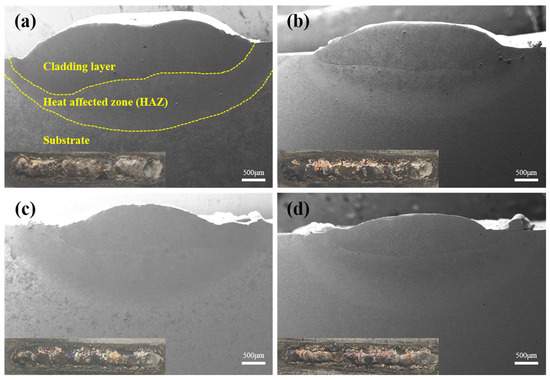 From Figure 4a–d, with the increase in the CeO2 content, the surface of coatings with 0.5 wt% and 1.0 wt% CeO2 became flat rather than rugged. This was because the addition of CeO2 increased the laser energy absorption of the material and promoted the flow of the molten pool, thus making the coating flatter. It was similar to the results of references [17,25,26]. Meanwhile, the high chemical activity of CeO2 reduced the surface tension of the molten alloy, which caused the molten alloy to flow toward the center of the molten pool and to form a wedge-shaped cladding layer [17]. However, the addition of excess CeO2 interrupted the coating with 1.5 wt% CeO2.