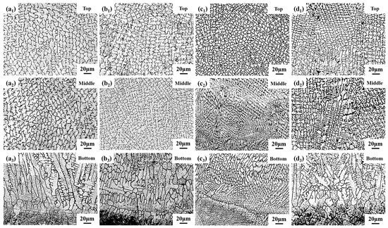 As shown in Figure 5(a1–a3), the coating could be divided into three regions based on the metal grain growth: top, middle, and bottom. The metal grain morphology in different regions of the coating mainly depended on the temperature gradient G and solidification rate R [27,28]. The bottom of the coating first formed columnar crystals by epitaxial growth in the direction of the temperature gradient through non-uniform nucleation. Meanwhile, the low solidification rate at the bottom of the coating allowed the metal grains to fully develop to form cellular crystals. Therefore, columnar crystals mainly dominated at the bottom of the coating. The temperature gradient G at the top and middle of the coating decreased, the solidification rate R increased, and the value of G/R was small. The metal grains were refined and did not grow selectively but grew and developed in multiple directions to form equiaxial crystals and dendritic crystals. Therefore, equiaxial crystals and dendrites dominated at the top and middle of the coating.