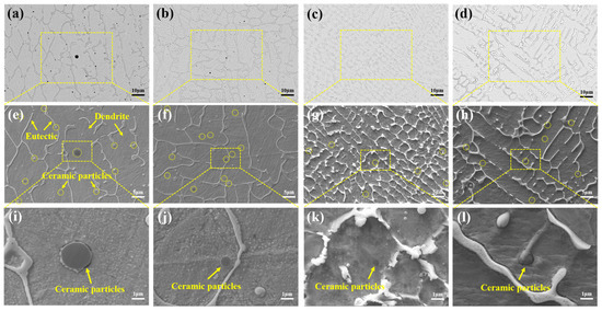 With the increase in the CeO2 content, the particle size of ceramic-reinforced phases such as MgAl2O4 decreased continuously (Figure 6a–d), and the particles gradually migrated to the grain boundaries (some of the ceramic particles were marked by yellow dashed lines). On the one hand, the addition of CeO2 enhanced the molten pool fluidity. The melt eroded the ceramic particles and reduced the particle size. The refinement of the ceramic particles enhanced the particle dispersion-strengthening effect. On the other hand, the flow of the melt pool would drive the ceramic particles toward the high-activity sites where CeO2 was located, and the ceramic particles pinned at the grain boundaries and refined the metal grains [32,33]. The metal grain size decreased first and then increased with the increase in the CeO2 content, as shown in Figure 6e–h. The effect of the CeO2 content on the coating structure is shown in Figure 7. In addition, some of the MgAl2O4 decomposed under low oxygen partial pressure conditions. The main composition of the ceramic particles was Al2O3, which was similar to the findings of Yan et al. [34,35]. The elemental distribution of the ceramic particles is shown in Table 1.