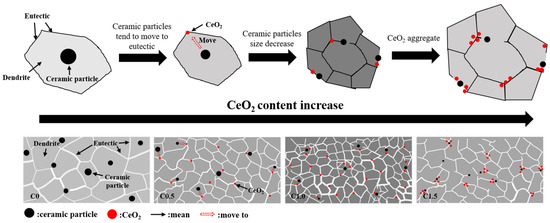 Comparing with Figure 5(a2–d2), it was shown that with the increase in the CeO2 content, the metal grain size decreased first and then increased. This was because the addition of CeO2 improved the latent heat of melting, increased the solid-phase temperature of the molten pool, and reduced the solidification temperature range and solidification time, thus shortening the metal grain development time; meanwhile, the high melting point of CeO2 made some of the unmolten CeO2 act as nucleation sites to promote the non-uniform nucleation of metal grains. The highly chemically active CeO2 was generally located at the grain boundaries and reduced the critical nucleation energy, which promoted the nucleation of metal grains and hindered the metal grain growth [19,29,30]. When the CeO2 content was 1.0 wt%, the metal grain size of the sample C1.0 was the smallest. However, when the CeO2 content was 1.5 wt%, excess CeO2 was aggregated, reducing the effect of rare earths on the metal grain refinement [31].