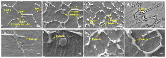 There was a height difference between the eutectic structure and the dendritic structure under the aqua regia etching condition, as shown in Figure 8(a2–d2). This was because the eutectic structure with a higher Cr content exhibited stronger corrosion resistance than the surrounding dendritic structure. With the addition of CeO2, the Cr content in the eutectic structure of samples C1.0 and C1.5 increased, as shown in Table 1. The height difference between the eutectic structure and the dendritic structure in samples C1.0 and C1.5 further increased. Indirectly, it proved the enhancement of CeO2 on the enrichment of Cr elements.