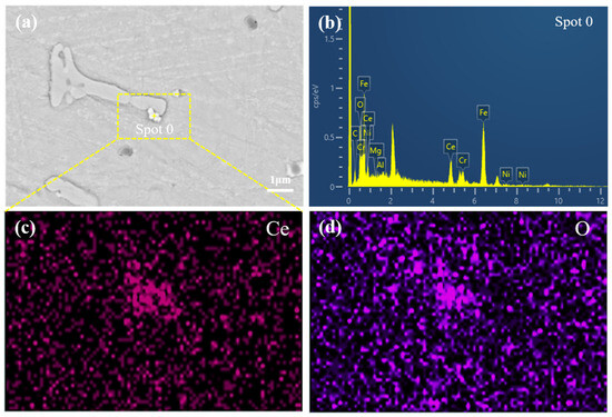 Elemental distribution of CeO2 particles in sample C1.5: (a) BSE images of sample C1.5; (b) the peak map of the elemental distribution of CeO2 particles; (c) map-scanning elemental distribution of Ce in CeO2 particles; (d) map-scanning elemental distribution of O in CeO2 particles.