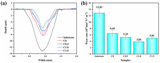 The coefficient of friction of the substrate decreased abruptly at 10 min of reciprocal friction, as shown in Figure 11a. The continuous oxide film appearing in the substrate during friction acted as a lubrication phase to reduce the friction coefficient. Compared with the substrate, the friction coefficients of samples C0, C0.5, C1.0, and C1.5 were more stable with less fluctuation, which was related to the increase in the hardness of the coating. When the hardness increased, the coating could effectively resist the pressure in and shear of the grinding ball during the friction process, thus enhancing the stability of the friction coefficient.