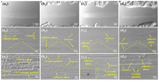 As shown in Figure 13(a3–d3), the ceramic particles were present in all samples (some of which were marked by yellow dashed lines). The improvement in the ceramic particles on the wear resistance of the coating was mainly reflected in two ways. On the one hand, it increased the hardness of the coating to resist the pressure and shear force of the grinding ball. On the other hand, increasing the number of abrasive particles reduced the contact area between the grinding balls and the coating.