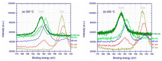 In-depth photoelectron spectra in the range of 150~170 eV for IGZO/SiO2 samples annealed at different temperatures (Ta) are given in Figure 1. With increasing depth from the IGZO surface, variations in the photoelectron spectra can be divided into three stages. First, only one component centered at ~161.0 eV was observed in the spectra, the position of which agreed with that of the Ga3s component for the Ga2O3 reference samples [23]. This component can be attributed to the Ga-O bonds within the IGZO layer. The position as well as line shapes of the spectra at the first stage were almost unchanged (see the green spectra in Figure 1), indicating a uniform IGZO layer. Second, the Ga3s component shifted towards a lower binding energy (BE) side and an additional component at ~153.0 eV appeared. BE of the latter component was close to that of the Si2s component of SiO2 [24]. Such double-peak spectra suggest an IGZO-SiO2 interfacial mixing layer, the thickness of which was ~15 ± 2 nm. The interfacial mixing layer can be seen as the result of the implantation of atoms from the oxide target into the SiO2 surface. Third, there was only one Si2s component in the following spectra, which can be attributed to the signal from a SiO2 layer. The above variations indicate that the film structure of IGZO/SiO2 includes three parts: an IGZO layer, an IGZO/SiO2 interfacial mixing layer, and a SiO2 layer. The effects of Ta on the atomic structures of these three parts were further investigated.