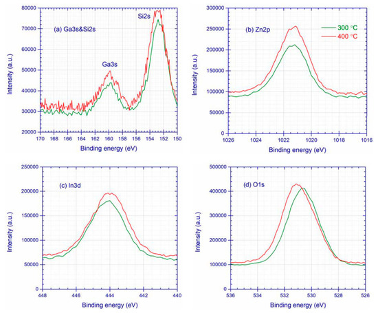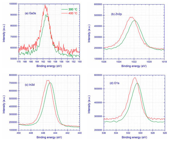 (a) Ga3s, (b) Zn2p, (c) In3d, and (d) O1s spectra of the IGZO layer annealed at 300 °C and 400 °C. The spectra were collected at a depth of 5 nm from IGZO surface.