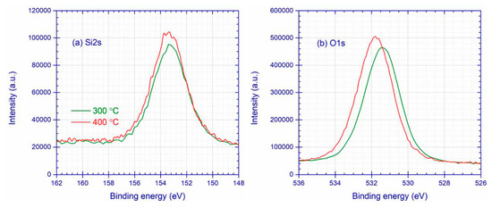 (a) Si2s and (b) O1s spectra of SiO2 layer annealed at 300 °C and 400 °C.