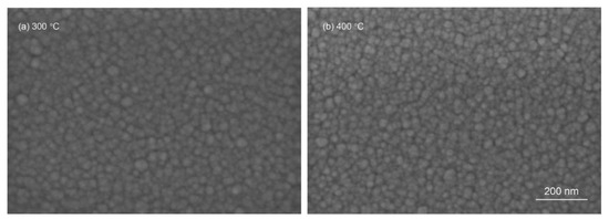 Figure 5 displays the surface morphology of IGZO layers annealed at different Ta. IGZO layers annealed at both Ta were columnar structures and their columnar widths were comparable (35 ± 5 nm). This result suggests that annealing temperatures over 300~400 °C had no effect on the surface morphology of IGZO layers.