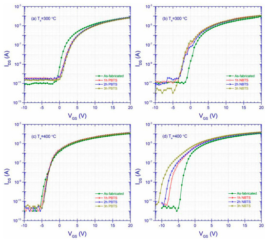 Transfer characteristic curves of the TFTs with IGZO annealed at 300 °C and 400 °C during 3h positive bias temperature stress (PBTS) and negative bias temperature stress (NBTS) (a–d).
