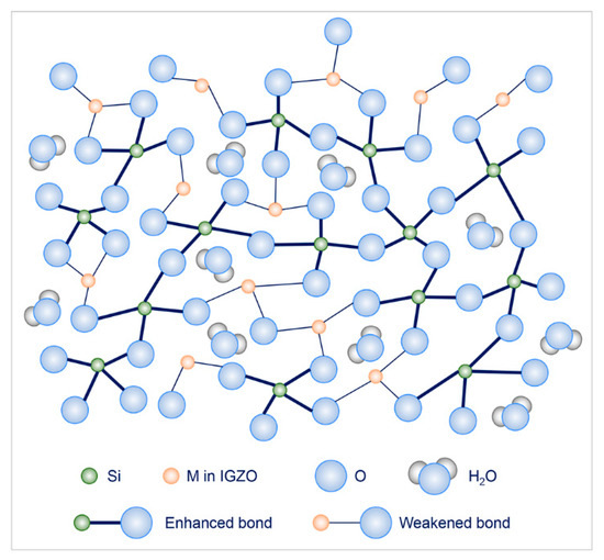 Schematic drawing of dual effects of higher Ta on structure of IGZO-SiO2 mixing layer: enhanced Si-O bonds, weaker M-O bonds, and more H2O molecules.