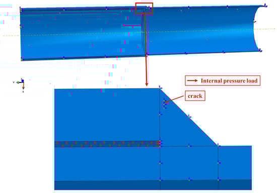 In order to emulate the actual working conditions, the model incorporated fixed constraints at both ends, axisymmetric constraints in the Y direction for the pipe cross-section, and an outward internal pressure of 10 MPa applied to the inner wall of the pipeline, as depicted in Figure 2.