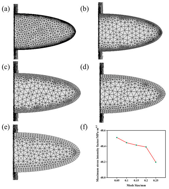 In order to determine the influence of the mesh size on the simulation results during the simulation process, the inserted cracks were divided into mesh sizes of 0.25 mm, 0.2 mm, 0.15 mm, 0.1 mm, and 0.05 mm, with the mesh size of 0.25 mm, 0.15 mm, 0.1 mm, and 0.05 mm, respectively, as shown in Figure 4a–e, for example, in the case of L1-10v3. The calculated maximum stress intensity factors are shown in Figure 4f, which were 48.51 MPa·m1/2 for a grid size of 0.05 mm, 48.45 MPa·m1/2 for a grid size of 0.1 mm, 48.41 MPa·m1/2 for a grid size of 0.15 mm, and 48.41 MPa·m1/2 for a grid size of 0.2 mm. The maximum stress intensity factor was 48.39 MPa·m1/2 for a mesh size of 0.2 mm and 48.2 MPa·m1/2 for a mesh size of 0.25 mm. The smaller the mesh size, the larger the maximum stress intensity factor, the higher the simulation accuracy, but the longer the simulation calculation time. In order to ensure the accuracy of the calculation results and improve the calculation efficiency, the mesh size of the model was chosen as 0.15 mm.