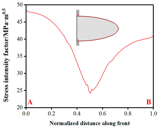 L1-10v3 was taken as an example to analyze the stress distribution and the change in stress intensity factor at the crack location. The fillet weld crack was planned, and Figure 5 shows the stress distribution after bearing the buried crack L1-10v3, where maximum (Max.) principal, middle (Mid.) principal, and minimum (Min.) principal are the principal stresses in different directions. From the figure, it can be seen that the stresses inside the elliptical crack region were obviously slightly higher than the stresses outside the region, but no obvious stress concentration was found. From the results of different principal stresses, it can be found that the different principal stresses were higher in the region around the tip of the crack line, with the maximum stress reaching 596.1 MPa, and these locations are the regions where the crack extended further outward. Figure 6 shows the variation of the stress intensity factor at different locations on the L1-10v3 crack, where the horizontal coordinates are the results of the normalization of the crack location, in which the stress intensity factor at location A was the largest, 48.41 MPa·m1/2, and that at the crack tip location was the smallest, 24.15 MPa·m1/2, which may be due to the small curvature at locations A and B, and close-to-the-crack-tip location of the curvature was large.