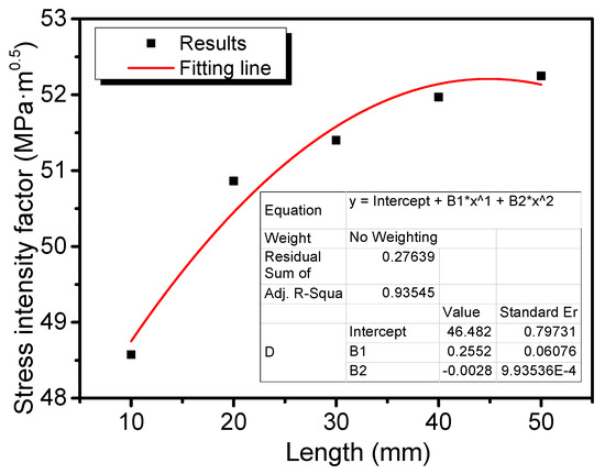 To systematically assess the impact of the buried crack’s length on the stress intensity factor, we conducted comparative analyses, simulating the maximum stress intensity factor under load for cracks of varying lengths, with the crack depth fixed at 3 mm and the crack positioned at L1. Simulation results, as depicted in Figure 7, revealed that for a crack length of 10 mm, the maximum stress intensity factor was 48.6 MPa·m1/2. This value escalated with an increase in the crack length, reaching a maximum stress intensity factor of 52.25 MPa·m1/2 for a 50 mm crack length. The relationship between the maximum stress intensity factor and the lengths of the three cracks examined suggested a near-linear increase. A regression analysis of the maximum stress intensity factor for different crack lengths, considering a crack height of 3 mm at the L1 position, yielded the fitted equation presented in Equation (1):