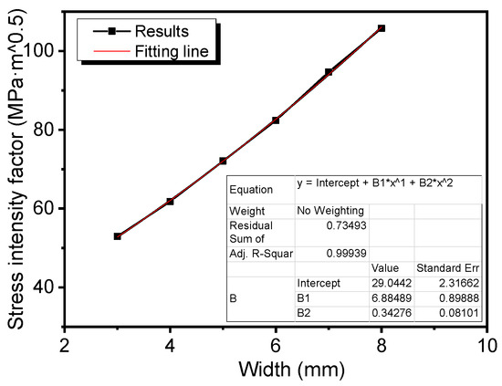 The maximum stress intensity factor after loading with different crack heights at the L position is shown in Figure 8. From the figure, it can be seen that the maximum stress intensity factor was 52.4 MPa·m1/2 when the height of the crack itself was 3 mm. With the increase in the height of the crack itself, the maximum stress intensity factor was increasing, and the maximum stress intensity factor was 105.76 MPa·m1/2 when the height of the crack itself was 8 mm. The maximum stress intensity factor under the different heights of the crack itself increased approximately linearly, and the maximum stress intensity factor under different heights of the crack itself at position L was fitted. At a length of 30 mm, the maximum stress intensity factor under different heights of the crack itself was fitted, and the fitted equation is shown in Equation (2):
