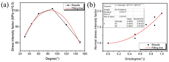 The maximum stress intensity factor after bearing at different crack angles in the L position is shown in Figure 9a. From the figure, it can be seen that the results of the maximum stress intensity factor at different angles differed greatly: the stress intensity factor at 30° was 67.44 MPa·m1/2, and the stress intensity factor at the 90° position was the largest, which was 102.4 MPa·m1/2. The maximum stress intensity factor at 120° was 60.9 MPa·m1/2, and the result is close to that of the maximum stress intensity factor at 30°. It can be found that the value of the maximum stress intensity factor increased with the increase of the crack angle from 0 to 90°, and the stress intensity factor was at its maximum when the crack angle was 90°. At a crack angle of 90~180°, the maximum stress intensity factor value started to decrease with the increase in the crack angle. The normalized results of the maximum stress intensity factor at different crack angles are shown in Figure 9b, and the fitted equation is shown in Equation (3):