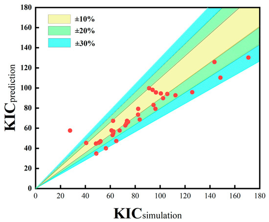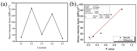 Considering the crack length, its own height, angle, and position, regression was performed to obtain the L position statistical model, and the maximum stress intensity factor prediction formula was obtained, as shown in Equation (6):