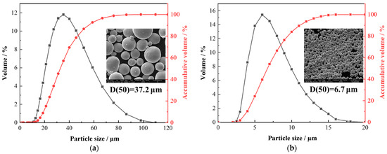 Figure 1 presents the size distribution and morphology of the spherical Ti and Ta powders. The size distribution measured by laser particle-size analyzer (Hydro 2000 MU, Malvern Panalytical, Malvern, UK) shows that the average sizes (D50) of Ti and Ta powders are 37.2 μm and 6.7 μm, respectively. The high-pressure cold-spraying system (PCS-100, Plasma Giken Co., Ltd., Saitama, Japan) was used to deposit coatings. The working gas for cold spraying was N2 with a pressure and temperature of 5.0 MPa and 850~900 °C, respectively. The lateral speed of the spray gun was 400 mm/s, and the spraying distance was fixed at 30 mm.
