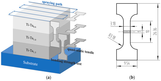 Schematic diagram of (a) cold-sprayed Ti–Ta graded coating and cutting position of samples; (b) size of the tensile samples.